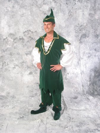 Elf - Santa's Santa's Elf: White shirt w/ green velvet tunic and pants w/ gold sequin trim, hat.